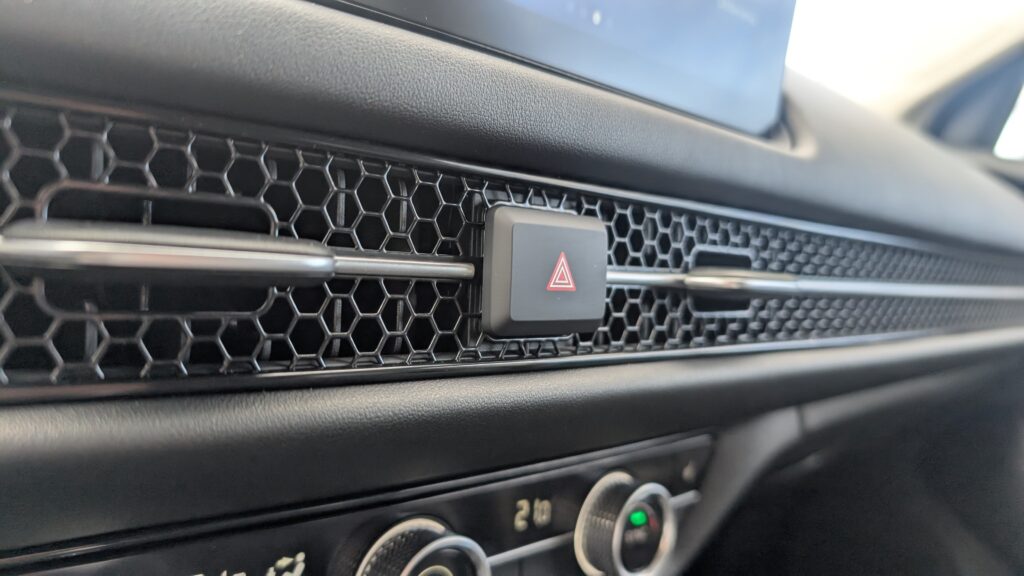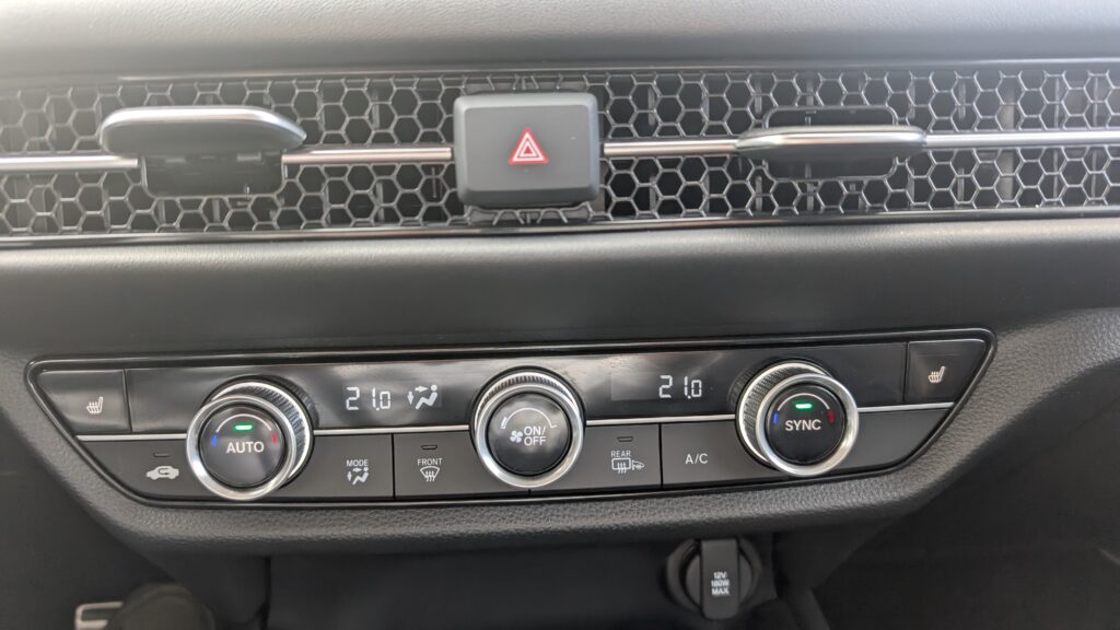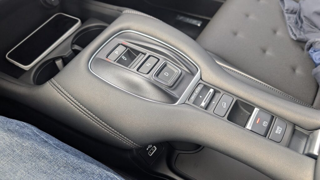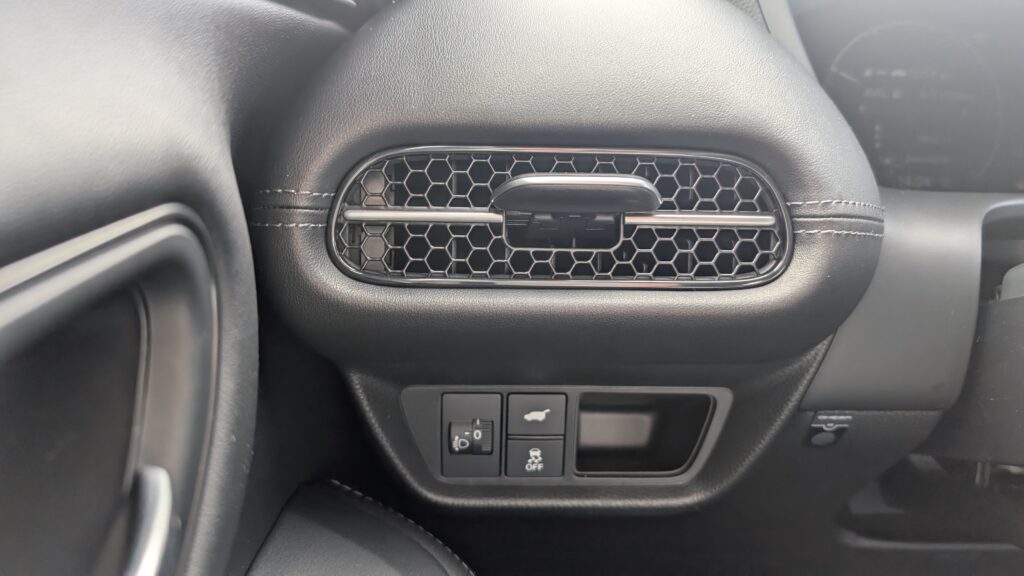 Wnętrze Hondy ZR-V to przestrzeń, w której kierowca od pierwszej sekundy czuje się jak w centrum dowodzenia, a wszystko zostało rozplanowane z niezwykłą dbałością o detale. Wygodna, świetnie leżąca w dłoniach kierownica zachęca do długich podróży. Tuż za nią znajduje się czytelny, siedmiocalowy wyświetlacz cyfrowych zegarów, który skrywa bardzo ciekawy detal – prawy wskaźnik pokazujący prędkość posiada fizyczną, ruchomą wskazówkę, co stanowi piękny ukłon w stronę tradycyjnej motoryzacji. Sama deska rozdzielcza ma poziomą, minimalistyczną architekturę ze sprytnie ukrytymi nawiewami, które zamaskowano wzorem siatki o strukturze plastra miodu. Poniżej, na konsoli środkowej, znajdują się intuicyjne przyciski i pokrętła obsługi dwustrefowej klimatyzacji, zapewniające szybki dostęp bez konieczności błądzenia po menu ekranu dotykowego. Schodząc niżej, trafiamy na obudowę szerokiego tunelu między siedzeniami, gdzie zamiast klasycznej dźwigni zmiany biegów zastosowano nowoczesne, fizyczne przełączniki i przyciski pełniące rolę selektora kierunku jazdy. Sam tunel oferuje również sprytnie wkomponowane uchwyty na napoje, niewielką tackę na drobiazgi oraz głęboki schowek ukryty pod podłokietnikiem.