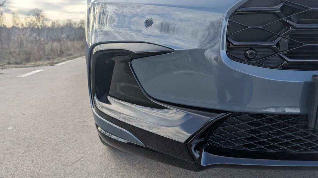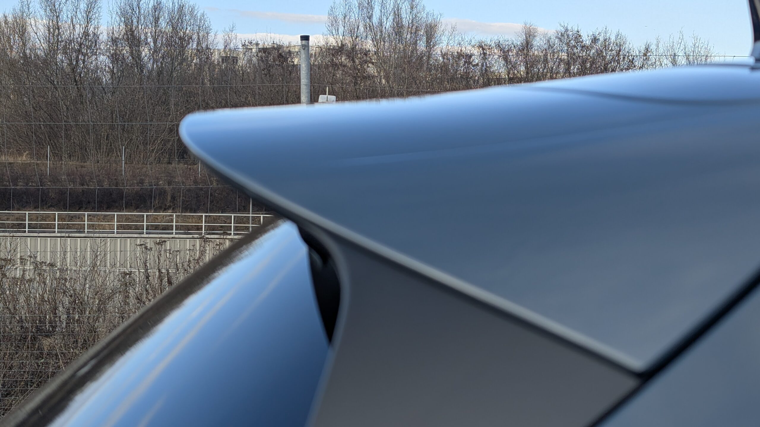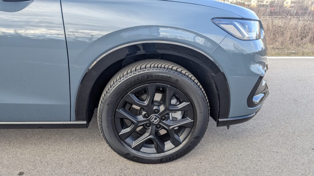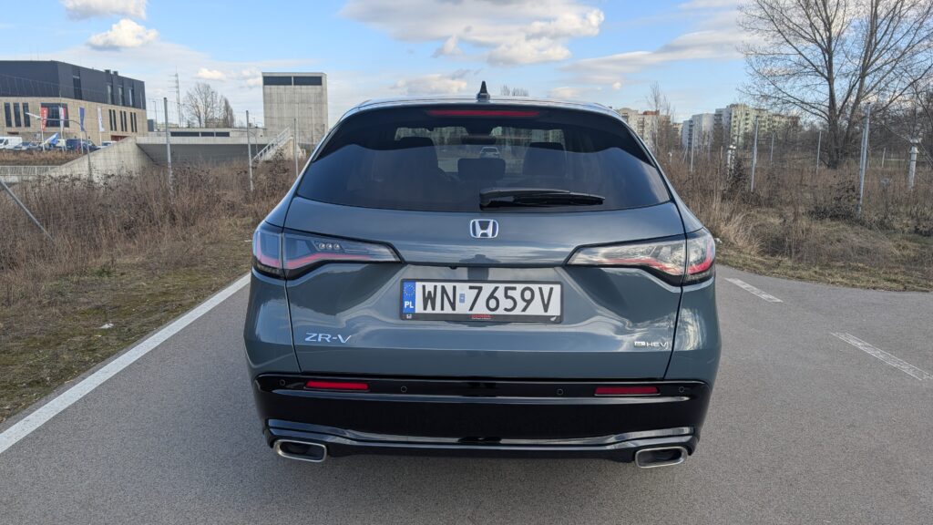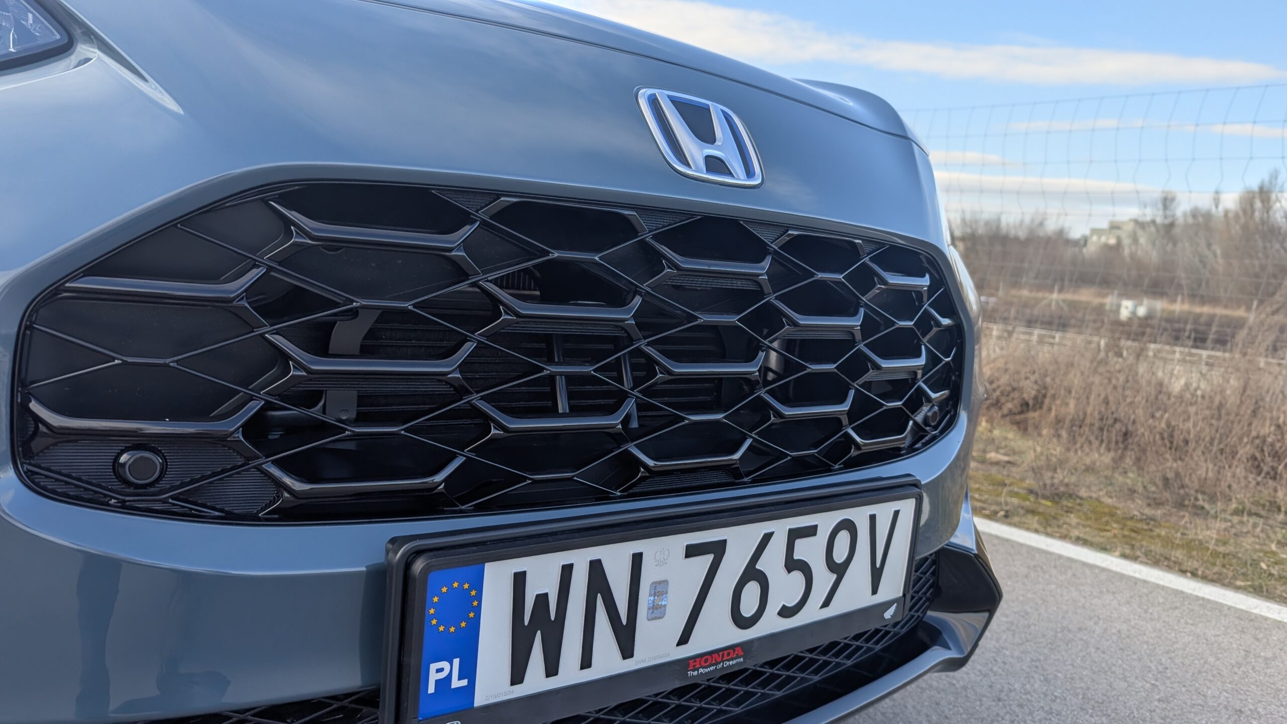 Honda ZR-V w testowanej wersji przyciąga spojrzenia przede wszystkim za sprawą dynamicznej i wyrazistej sylwetki, w której zrezygnowano z krzykliwych rozwiązań na rzecz eleganckich, mrocznych akcentów. Przód samochodu zdominowany jest przez charakterystyczny grill. Po obu stronach zderzaka wyraźnie podkreślono czarnym kolorem boczne wloty powietrza, co nadaje autu pewności siebie. Patrząc z boku, zauważymy czarne pasy dolne biegnące wzdłuż nadwozia, które wizualnie podnoszą ten model o kilka centymetrów, uwydatniając jego charakterystyczny dla klasy SUV prześwit. Profil uzupełniają przyciemniane tylne szyby, obudowy lusterek polakierowane na głęboką czerń oraz znakomicie prezentujące się osiemnastocalowe, aluminiowe obręcze w kolorze nocy. Z tyłu na pokrywie bagażnika dominuje czarna płetwa rekina, a w dolnej części zderzaka wyeksponowano dwa prawdziwe, srebrne zakończenia układu wydechowego, co jest rzadkością w dzisiejszych hybrydach. Dokładne wymiary Hondy ZR-V wynoszą 4568 mm długości, 1840 mm szerokości oraz 1620 mm wysokości.