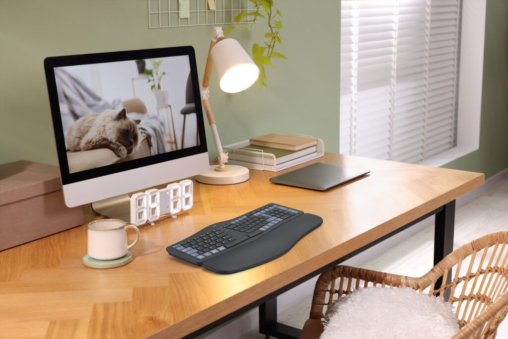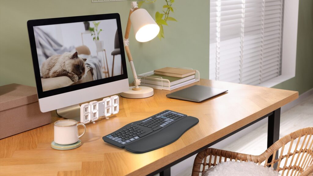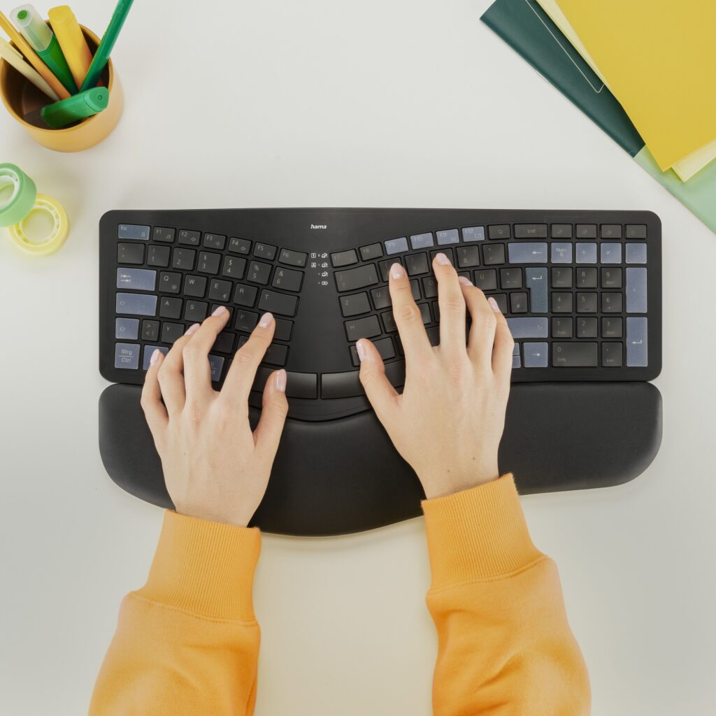 Co wyróżnia bezprzewodową klawiaturę ergonomiczną Hama WK-900 Ergo spośród propozycji konkurencji? Zacznijmy od podstawowego atutu, czyli podzielonego asymetrycznego układ klawiszy i wygodnej wyściełanej podpórki pod nadgarstki z naturalnym sposobem ułożenia dłoni. Dodajmy do tego ujemny kąt pisania, regulowane podświetlenie przycisków, mechanizm nożycowy klawiszy (ciche i szybkie pisanie) oraz łączność multi-device (radiowo plus dwa kanały Bluetooth). Tak oto za jednym kliknięciem przeskakujemy między laptopem, tabletem i PC.