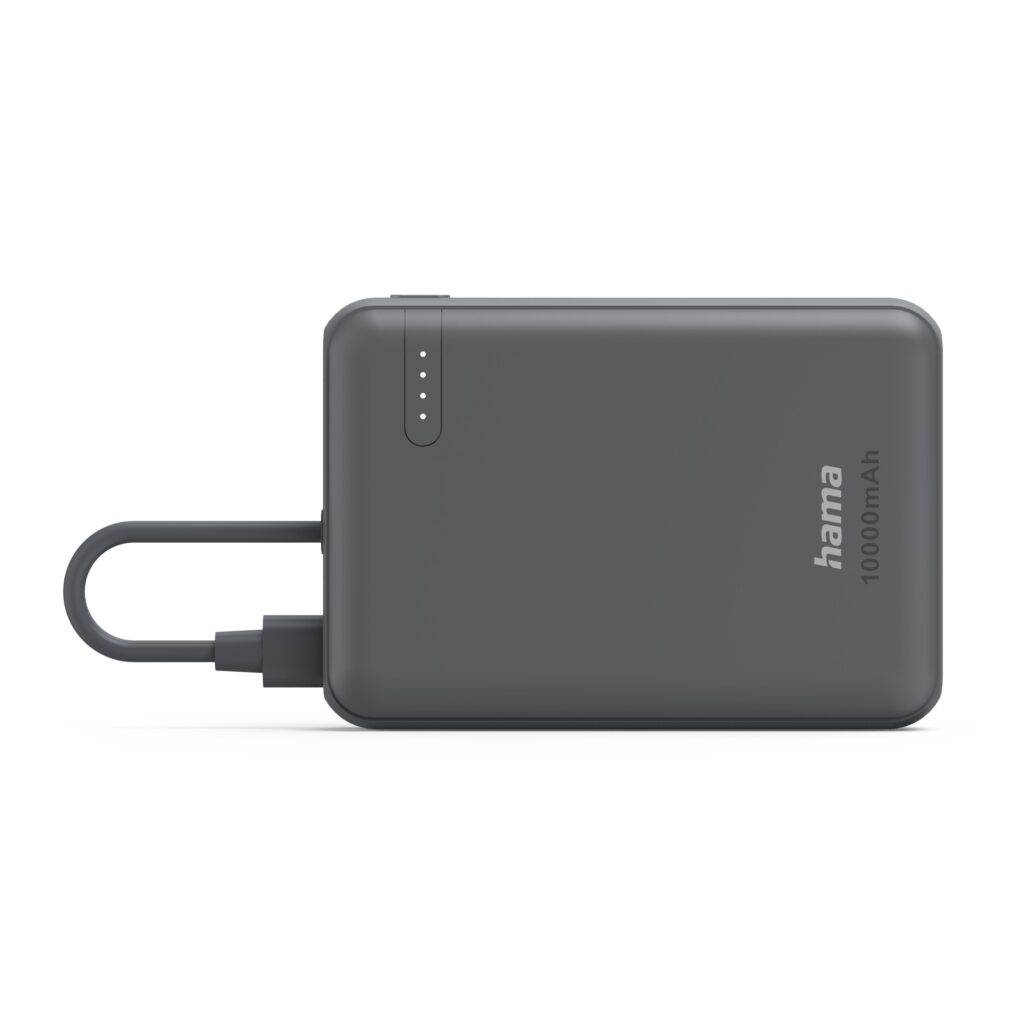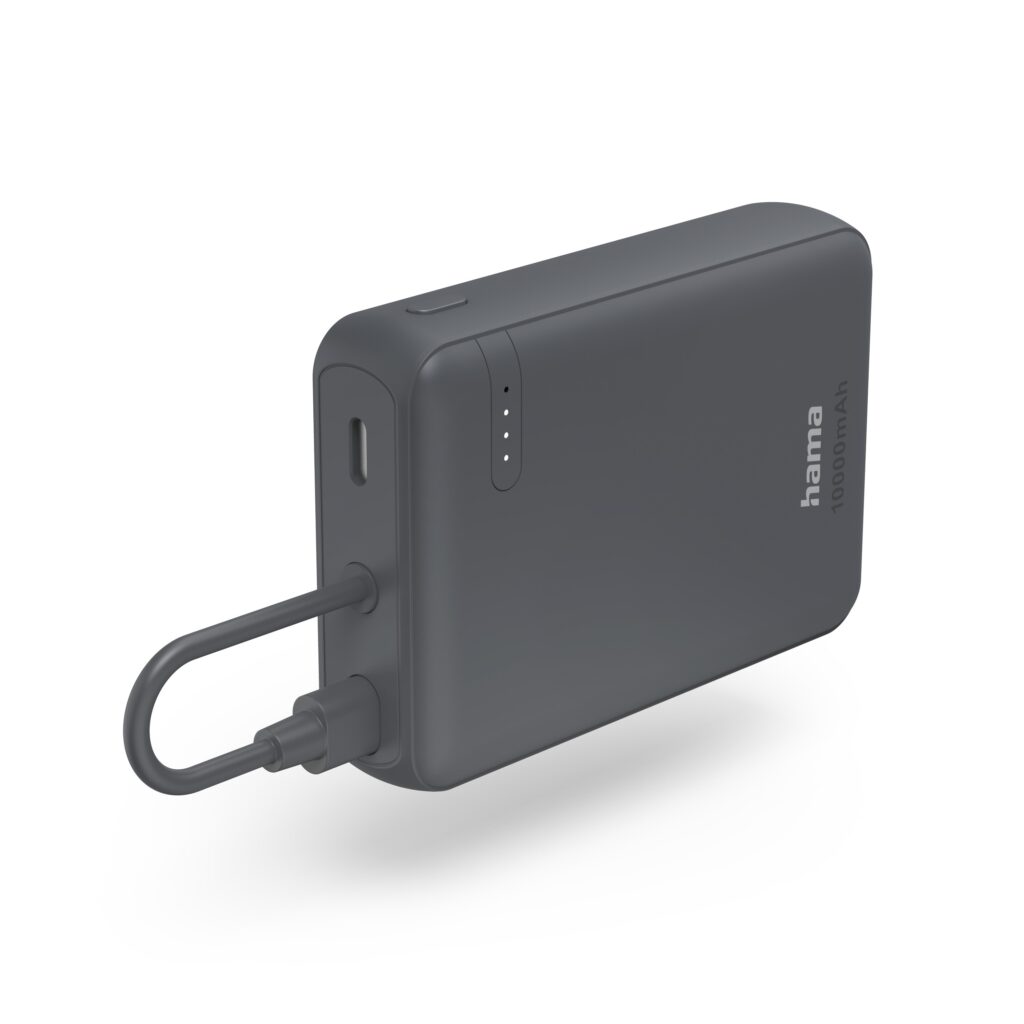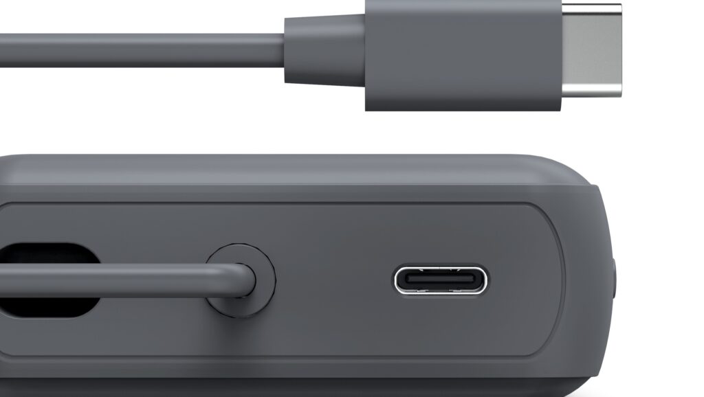 Największym wyróżnikiem nowego power packa Hama Travel jest zintegrowany przewód USB-C o długości 6,5 cm. To idealne rozwiązanie dla osób, które cenią sobie oszczędność miejsca w bagażu lub kieszeni. Co ciekawe, gdy kończymy ładowanie, złącze kabla można wygodnie wsunąć do dodatkowego portu USB-C w obudowie, tworząc estetyczną i zwartą bryłę. Jeśli jednak zajdzie taka potrzeba i podłączymy dodatkowy, zewnętrzny przewód, urządzenie bez problemu poradzi sobie z ładowaniem dwóch sprzętów jednocześnie (np. smartfona i słuchawek Bluetooth).