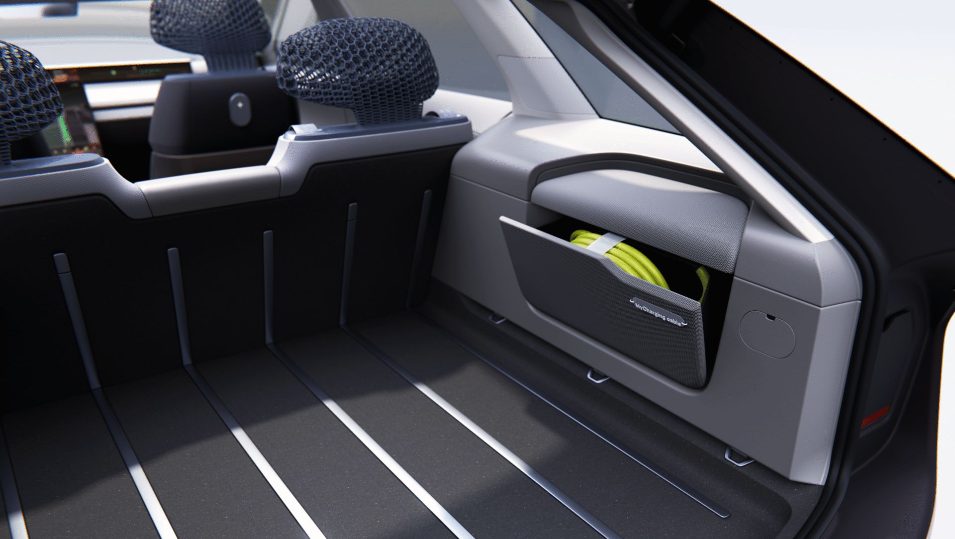 Fotele oraz elementy wnętrza powstały z płasko tkanej dzianiny wykonanej w 100% z recyklingowanego poliestru. Struktura materiału umożliwia precyzyjne dopasowanie do komponentów bez generowania odpadów, a także pozwala na zróżnicowanie faktury w obrębie jednej powierzchni. Zagłówki wykonano z elastycznego tworzywa Ultrasint TPU, którego produkcja odbywa się w technologii bezodpadowej.