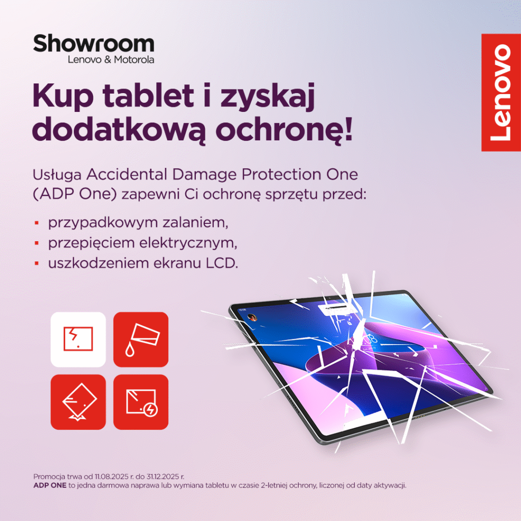 Aby wziąć udział w promocji należy do 31 grudnia 2025 r. nabyć dowolny tablet marki Lenovo w Showroomie Lenovo i Motorola w Warszawie i przy dokonywaniu płatności potwierdzić u sprzedawcy chęć skorzystania z promocji. Na stronie https://pcsupport.lenovo.com/ każdy klient ma możliwość sprawdzenia czy usługa została przypisana do jego urządzenia. Promocja obowiązuje do wyczerpania zapasów. Promocją objęte jest całe portfolio tabletów Lenovo w warszawskim Showroomie.