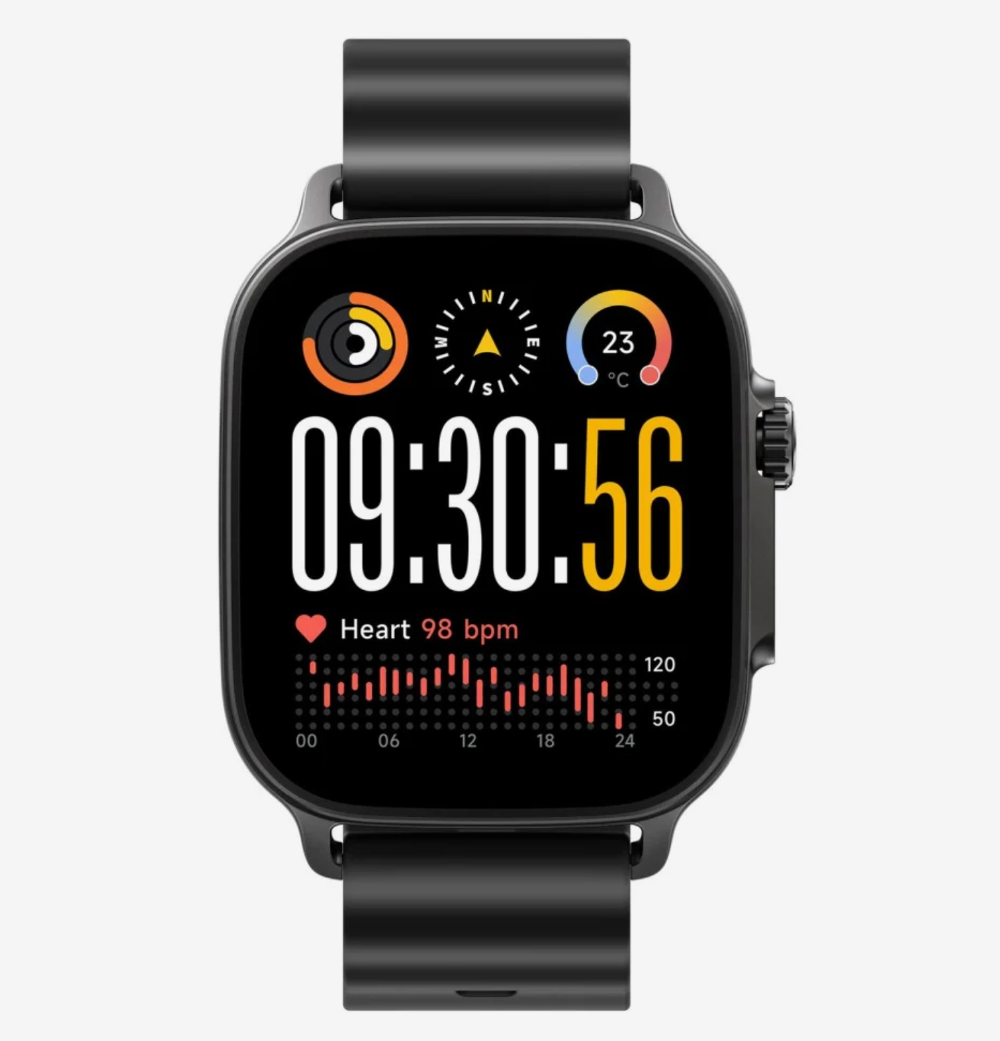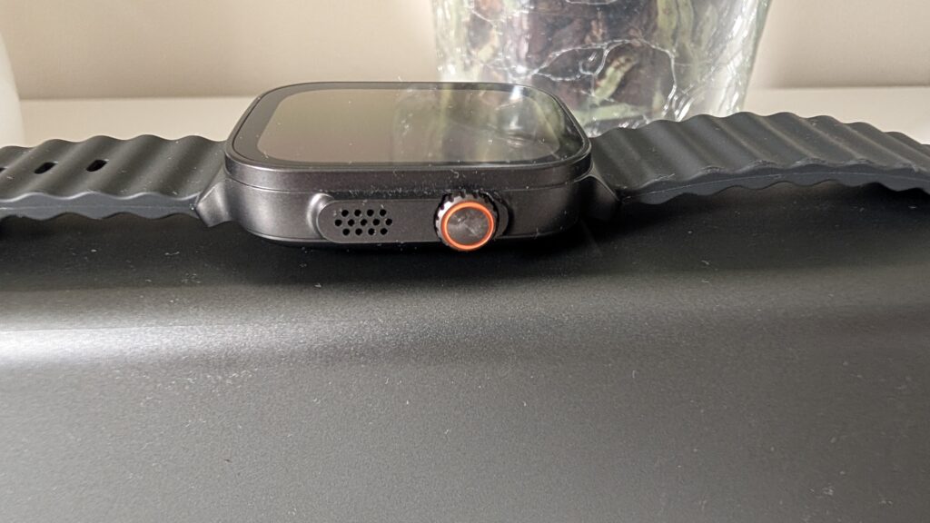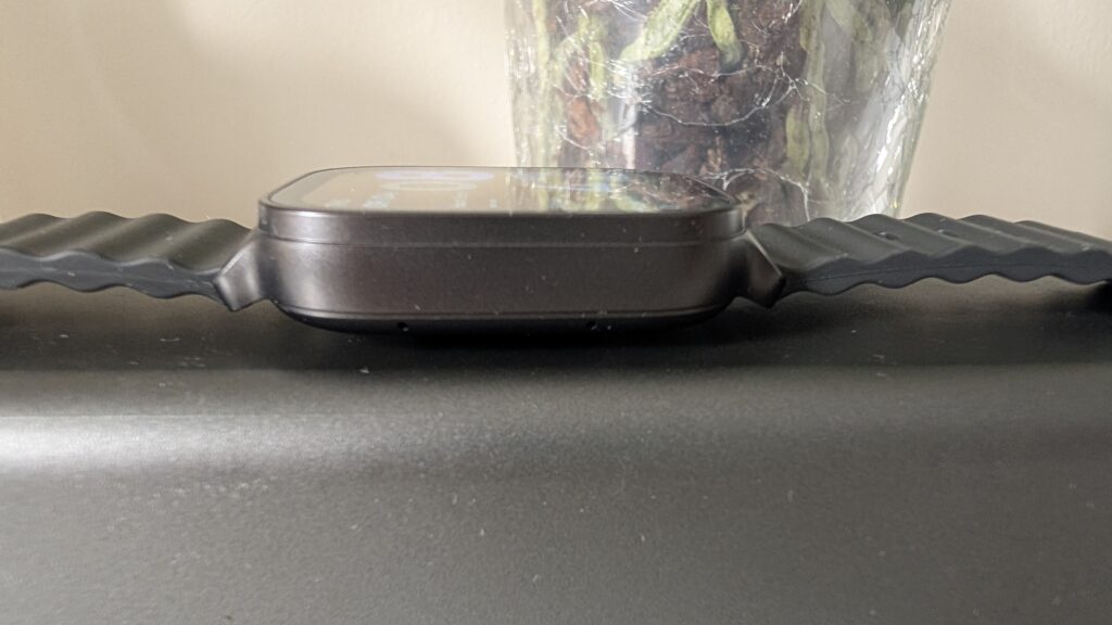 Górę zegarka w ogromnej części wypełnia matryca AMOLED o imponującej przekątnej 1,97 cala i wysokiej rozdzielczości 390 x 450 pikseli, co gwarantuje nam ostre i czytelne czcionki bez pikselozy. Technologia AMOLED, potrafiąca wygaszać pojedyncze subpiksele, daje nam tu dostęp do smolistej czerni i świetnego nasycenia barw. Co niezwykle istotne z punktu widzenia użytkowania na zewnątrz, producent wyśrubował jasność maksymalną do poziomu 600 nitów – jest to wartość pozwalająca na bezproblemowe odczytanie wiadomości tekstowych w samo południe, bez konieczności rzucania na ekran cienia dłonią. Standardowe odświeżanie na poziomie 60 Hz zapewnia gładkie animacje, a obecność uwielbianej przez użytkowników funkcji Always On Display (AOD) sprawia, że tarcza z godziną może być dyskretnie wyświetlana przez cały czas. W kwestii audio zegarek skrywa na bocznej ściance wbudowany głośnik oraz mikrofon, które wspierają rozmowy w trybie głośnomówiącym za pośrednictwem połączenia Bluetooth 5.3. Dźwięk nie rzuca na kolana krystaliczną czystością i ewidentnie brakuje mu głębi, jednak do krótkiej wymiany zdań z kurierem podczas jazdy na rowerze czy rozwieszania prania nadaje się wręcz rewelacyjnie.