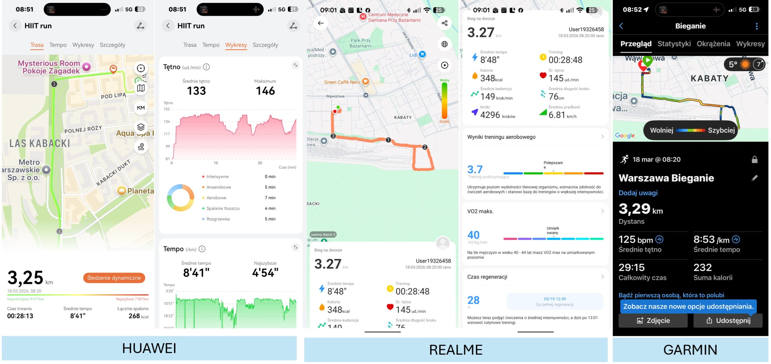 Podczas miejskich prób na gęsto zabudowanych ulicach Warszawy, sprzęt zaskakująco szybko komunikował się z satelitami i z bardzo przyzwoitą dokładnością rysował ścieżkę biegu, unikając irytujących przeskoków lokalizacji między budynkami. Jeśli mowa o wbudowanym optycznym czujniku tętna, podczas spacerów i powolnego truchtu wyniki były rzetelne i zbieżne z Garminem i Huawei. Urządzenie dostawało jednak klasycznej zadyszki analitycznej podczas bardzo intensywnych treningów interwałowych, łapiąc kilkusekundowe opóźnienia w rejestrowaniu gwałtownych skoków pulsu. Niestety, zegarek też pokazał moją najwyższe tętno jako średnie co, nie było prawdą. Zastanawiam się czy nie jest to po prostuy błąd w tłumaczeniu oprogramowania. Na pochwałę zasługuje wbudowany sensor natlenienia krwi (SpO2) i algorytm analityczny monitorujący jakość snu, który poprawnie rejestrował poszczególne fazy i oceniał nocną regenerację.
